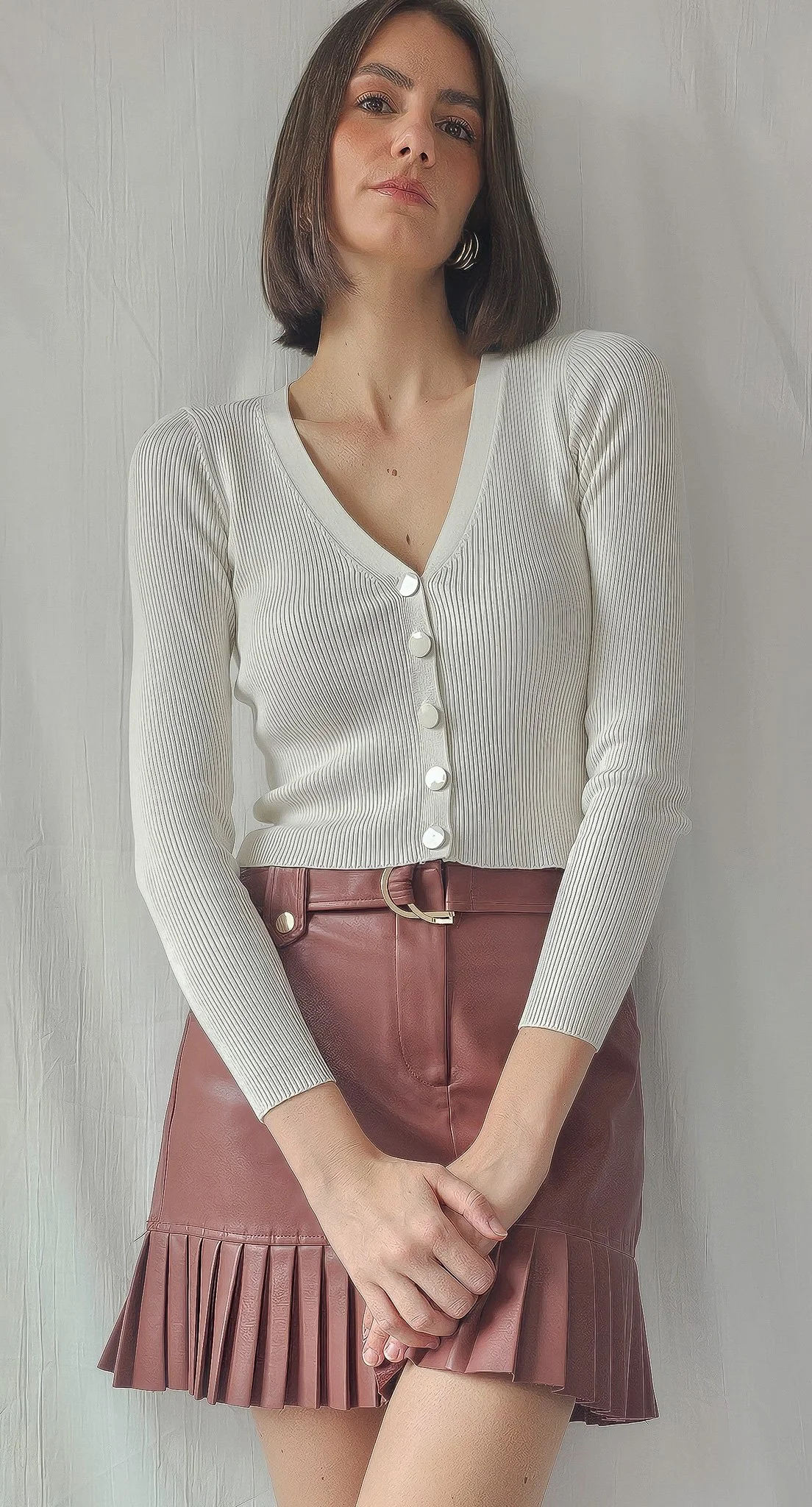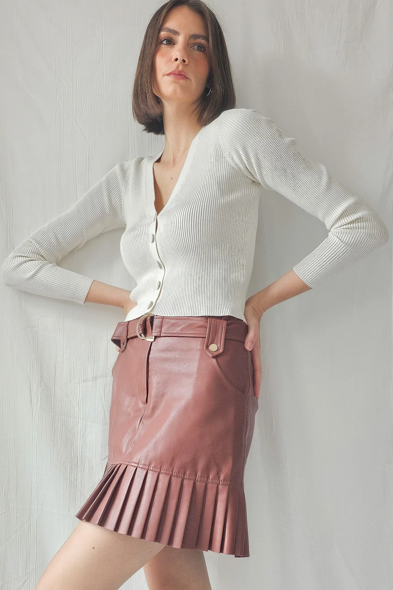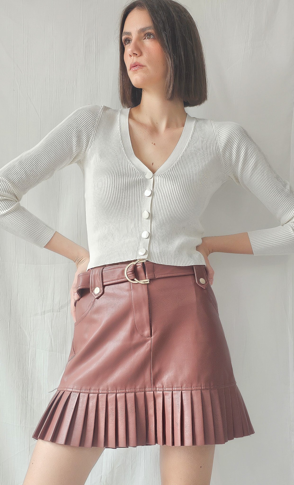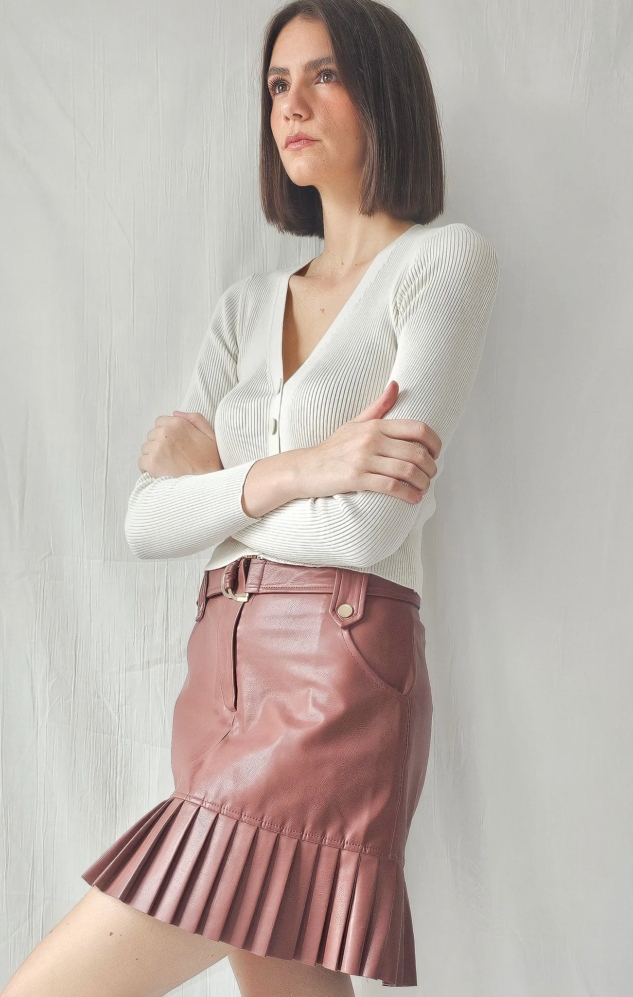 Ce look explore le contraste entre la douceur du coton côtelé et la structure affirmée du cuir. La jupe plissée, avec ses détails dorés et ses lignes architecturées, dialogue avec la simplicité du haut blanc. L’ensemble crée une silhouette bohème urbaine, à la fois intime et stylisée. Chaque image révèle la matière comme vecteur d’identité, entre sensualité et rigueur.