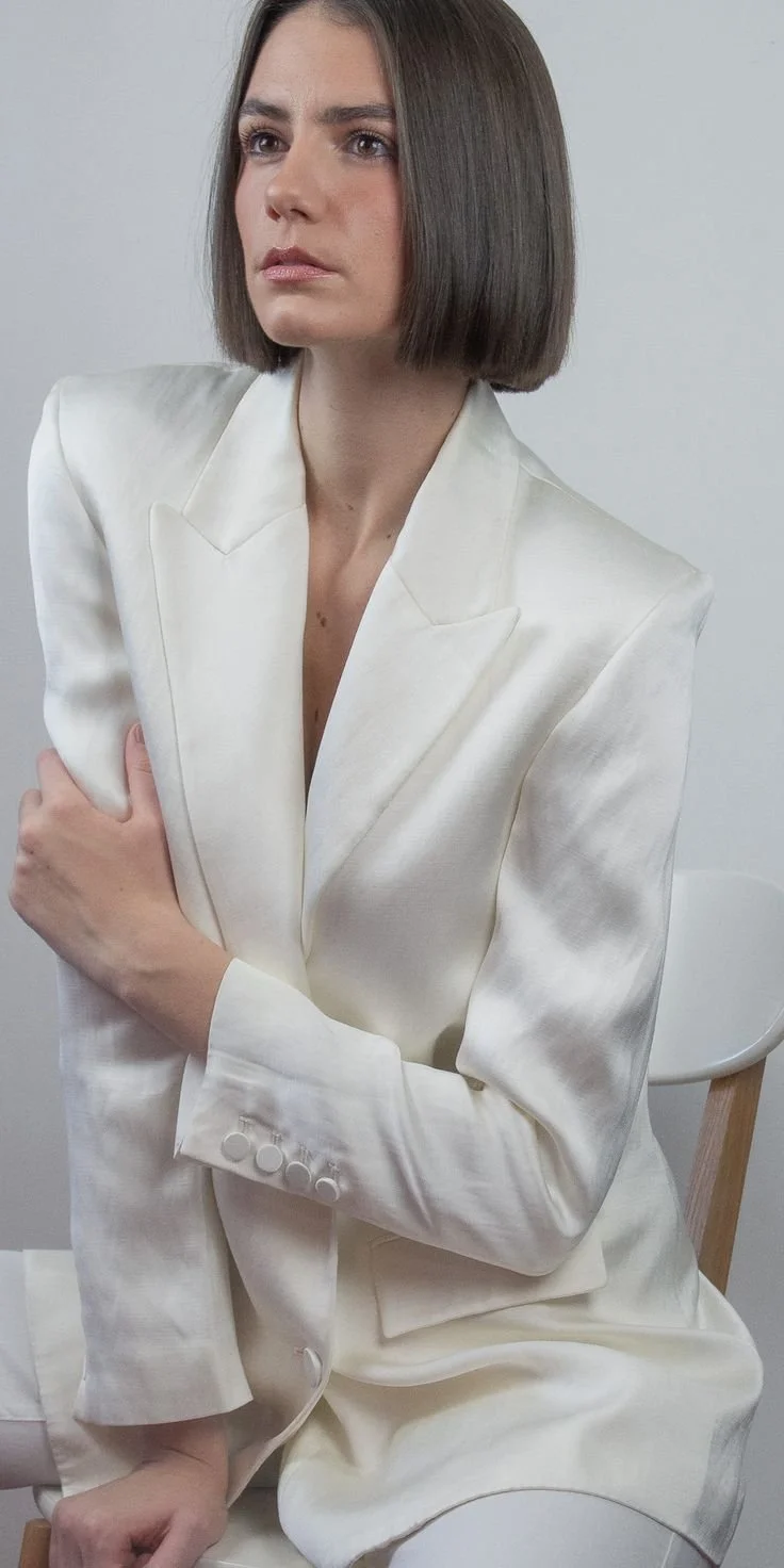 Ce look met en avant la force du minimalisme. Le tailleur blanc, structuré et élégant, incarne une présence affirmée. Les lignes nettes, la posture assise et le fond neutre composent une esthétique intemporelle, inspirée des éditoriaux de mode. Ici, la sobriété devient langage visuel : une élégance moderne, sobre et incarnée.
